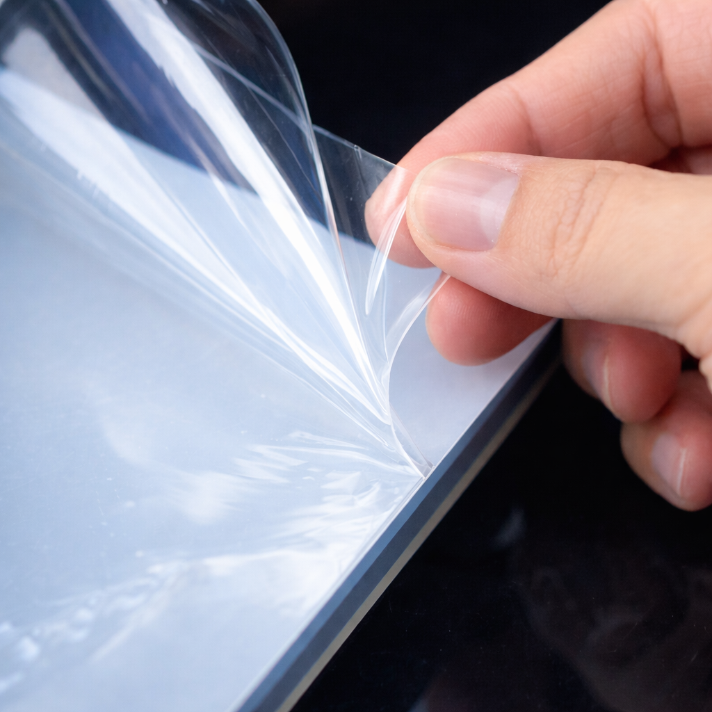 Ela deixa o produto levemente opaco. É necessário remover a película antes da instalação.Muitos clientes não percebem isso inicialmente.